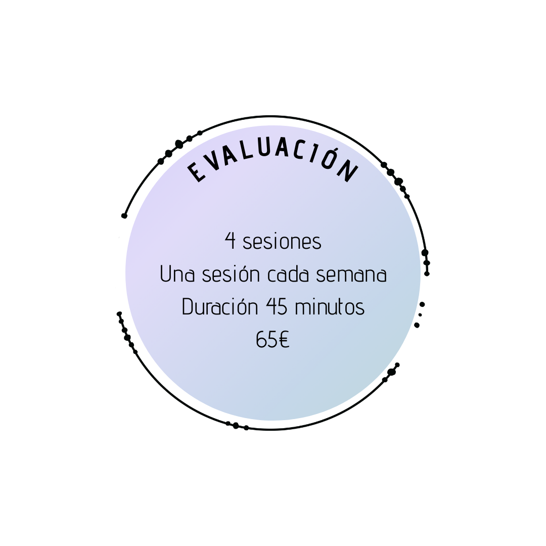 - Ebaluazioa (4 saio): lehen saioa (ordu bat) gurasoekin egingo da, haurraren eta familiaren informazioa jasotzeko. Ondoren, haurrarekin bi saio egingo dira (45 minutukoak), ingurunearekin eta psikologoarekin seguru sentitzea izango da helburu nagusia eta honetaz gain, bere ezaugarri nagusiak eta beharrak identifikatzea. Laugarren saioan, gurasoekin elkartuko gara berriz, helburuak zehaztu eta esku-hartzeari bide egiteko.